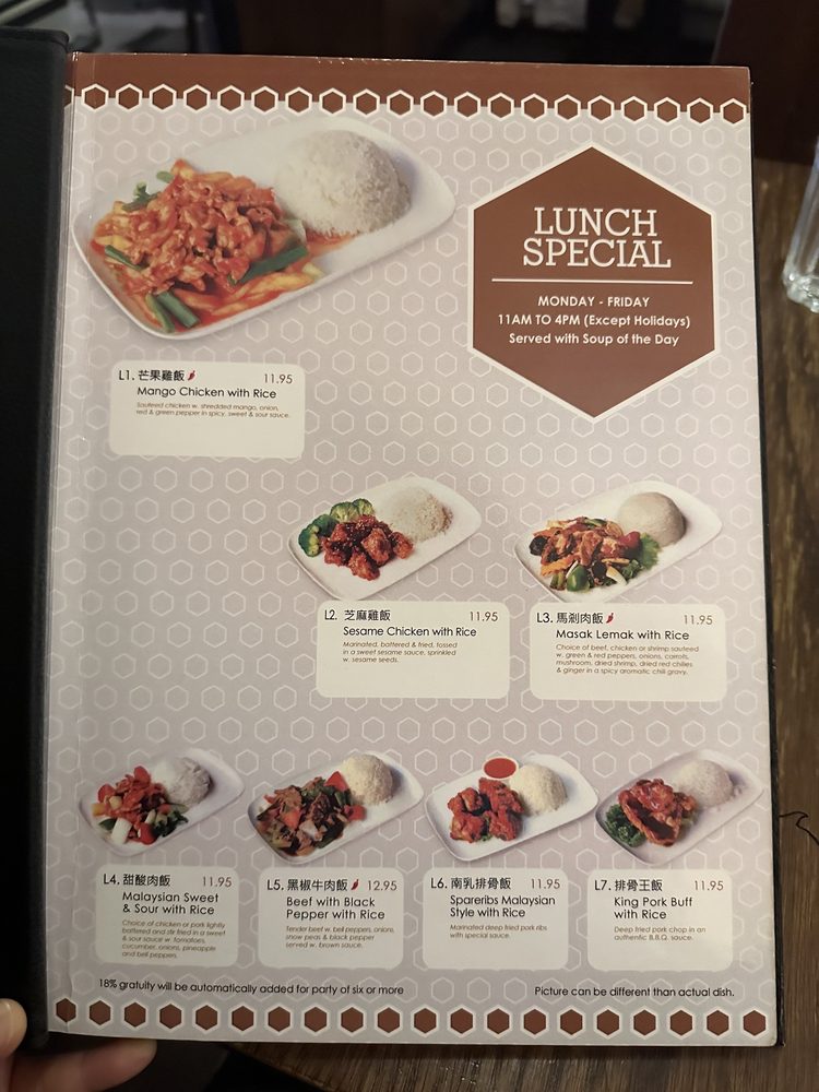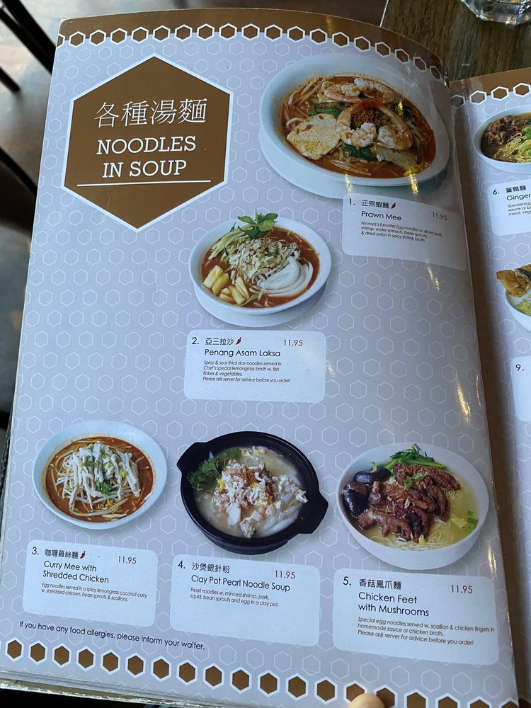 "Introducing the menu at Nyonya, located in New York City, offers a variety of Malaysian dishes that cater to different dietary preferences. With options like Roti Canai, Pasembur, and Salted Cabbage and Bean Curd Soup, Nyonya brings a taste of authentic Malaysian cuisine to its customers. Customers have raved about the flavorful dishes, such as the whole fried fish in black bean sauce and the spicy Asam Laksa. While the restaurant is cash-only, the reasonable prices and comforting Asian food make it a popular choice for those looking for a unique dining experience. The cozy ambience, fast service, and extensive menu make Nyonya a go-to spot for Malaysian food enthusiasts in the area. Overall, Nyonya scores high marks for its delicious offerings and welcoming atmosphere."